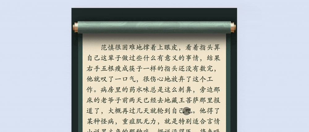 核心思路: 让卷轴的纹理图片进行无缝的垂直平移动画,并将其巧妙地融合到卷轴背景中。