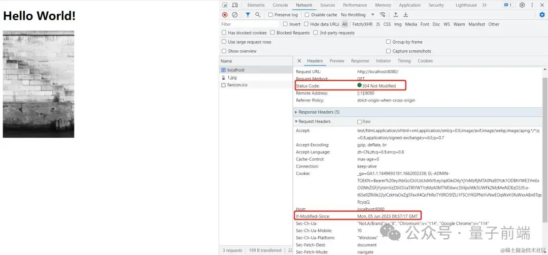 index.html可能会重新请求(取决于浏览器对导航请求的处理),状态码可能是200 OK或304 Not Modified(如果服务器也配置了协商缓存)。image1.jpg的状态码很可能是200 OK,但 Size 列会显示(memory cache)或(disk cache),Time 列接近 0ms。这表示浏览器直接从本地缓存加载了图片,没有发起网络请求。- 此时查看