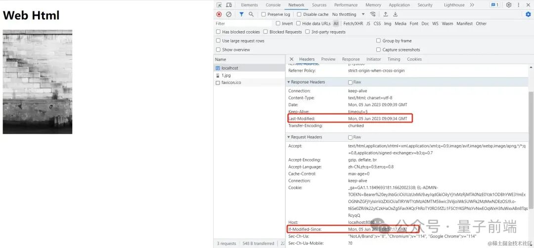 Last-Modified或ETag值会更新。 - 页面显示修改后的内容。 <img src="https://mmbiz.qpic.cn/sz_mmbiz_jpg/IlE1Y2rl1uZiaicXaMXRX62V7hsnA4XcFGE5wFVlqePJC82Y9VcamibrykuyRY7mUOo9EmzXiayzIgBbmAqsETzRpA/640?wx_fmt=other&from=appmsg&tp=webp&wxfrom=5&wx_lazy=1&wx_co=1" alt="修改文件后刷新,状态码 200,协商缓存发现资源已更新">